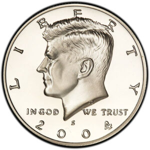 The obverse shows a portrait of John Fitzgerald Kennedy, the youngest-ever-elected president. United States Mint Sculptor-Engraver Gilroy Roberts based this profile on a portrait prepared for Kennedy presidential medal. Roberts created this design immediately after Kennedy assassination.