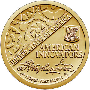 The reverse design features George Washington’s signature and the inscriptions UNITED STATES OF AMERICA, AMERICAN INNOVATORS, and SIGNED FIRST PATENT. The stylized gears represent industry and innovation. The year of minting, mint mark, and inscription