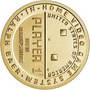 In 1966 Ralph Baer began to investigate how to play games on a television. He and his team developed the Brown Box, a prototype for the first multi-player, multi-program video game system. This paved the way for all video game systems that followed. Baer is known today as The Father of Video Games. The reverse design depicts Ralph Baer’s brown box game Handball on the right side of the coin. The left side features NEW HAMPSHIRE and PLAYER 1 on an incused background. The inscriptions IN-HOME VIDEO GAME SYSTEM and RALPH BAER encircle the coin in a text that is meant to pay homage to Baer’s Odyssey game. The additional inscription is UNITED STATES OF AMERICA. The design is also symbolic of an arcade token.