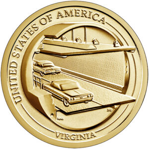 The American Innovation Dollar Coin representing Virginia honors the Chesapeake Bay Bridge-Tunnel, recognized as an engineering marvel of the modern world. Opened in 1964 and spanning more than 17 miles of open water, the Chesapeake Bay Bridge-Tunnel connects southeastern Virginia to the Delmarva Peninsula. It consists of 12 miles of low level trestle, two mile long tunnels, two bridges, two miles of causeway, and four man-made islands. The reverse design depicts a view of the Chesapeake Bay Bridge-Tunnel as a cross section cut away, illustrating the ingenuity involved in constructing it. Inscriptions are United States of America and Virginia.