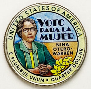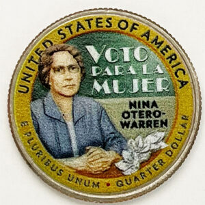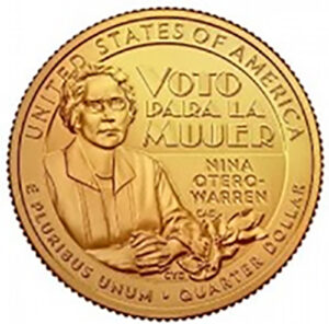 The reverse side design features an image of Adelina (Nina) Otero-Warren on the left, flanked by three individual Yucca flowers – New Mexico’s state flower. The inscriptions are UNITED STATES OF AMERICA, QUARTER DOLLAR, E PLURIBUS UNUM, NINA OTERO-WARREN, and VOTO PARA LA MUJER, the Spanish counterpart for the suffragist slogan Votes for Women.