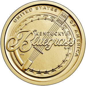 The reverse design features a banjo, an important bluegrass instrument, tilted to one side, alluding to the rhythm and movement of the music. Inscriptions are UNITED STATES OF AMERICA, BLUEGRASS, and KENTUCKY.