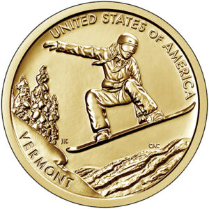 The 2022 American Innovation $1 coin representing Vermont captures a sense of the energy and exuberance of snowboarding through movement implied by diagonal lines and curved shapes. The reverse design features a young female snowboarder in the air performing a trick called a melon grab, set against a mountainous winter skyline inspired by the landscape of Vermont. Inscriptions are UNITED STATES OF AMERICA and VERMONT.