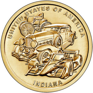 The Indiana American Innovation Dollar Coin reverse design features a series of vehicles that showcase Indiana innovations from yesterday and today. From top to bottom, the design includes an early style gas automobile, a representation of classic car production, and a recent model of an Indy style race car. Inscriptions are UNITED STATES OF AMERICA, and INDIANA.