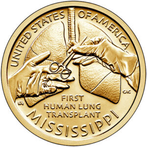 The Mississippi American Innovation Dollar Coin reverse design features a pair of human lungs in the background, while a surgical assistant passes forceps to the surgeon during the first lung transplant surgery. Inscriptions are UNITED STATES OF AMERICA, FIRST HUMAN LUNG TRANSPLANT, and MISSISSIPPI.