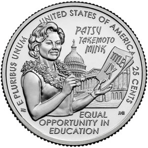 The reverse side depicts Patsy Takemoto Mink holding her landmark TITLE IX legislation.