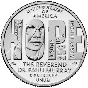The reverse side depicts Reverend Dr. Pauli Murray’s eyeglass-framed face within the shape of the word HOPE, which is symbolic of Murray’s belief that significant societal reforms were possible when rooted in hope. A line from her poem Dark Testament, characterizes hope as