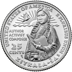The reverse side depicts Zitkala-Ša in traditional Yankton Sioux dress. She is holding a book, which represents her work as an author as well as her successful activism for Native American rights. Behind her, a stylized sun represents her work on The Sun Dance Opera, while a cardinal symbolizes her name, which translates to Red Bird. A Yankton Sioux-inspired diamond pattern sits underneath the sun. The inscriptions are UNITED STATES OF AMERICA, QUARTER DOLLAR, E PLURIBUS UNUM, AUTHOR, ACTIVIST, COMPOSER, and ZITKALA-SA.