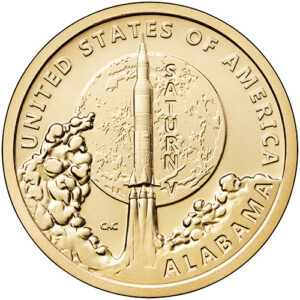 The Alabama American innovation Dollar Coin reverse design depicts the power and force of the Saturn V rocket lifting off with the Moon in the background. Included inscriptions are UNITED STATES OF AMERICA, SATURN V, and ALABAMA.