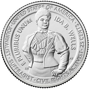 The reverse side depicts Ida B. Wells as she gazes courageously and proudly toward the future. Inscriptions are UNITED STATES OF AMERICA, E PLURIBUS UNUM, IDA B. WELLS, 25 CENTS, JOURNALIST, SUFFRAGIST, CIVIL RIGHTS ACTIVIST.